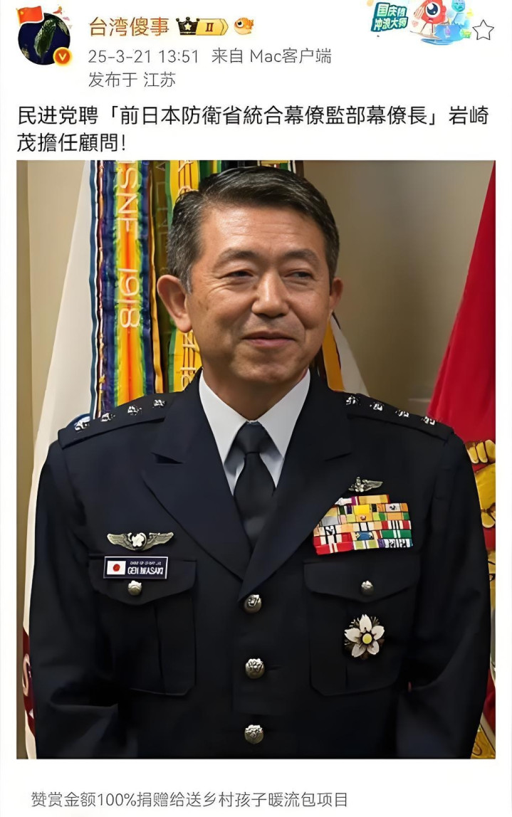 时间回拨至2025年3月,一个危险的政治信号从台湾地区发出:岩崎茂正式受聘担任台湾地区行政管理机构的所谓“政务顾问”,任期一年。此举使他成为首位担任该职位的日本前自卫队成员,标志着一个恶劣的先例。